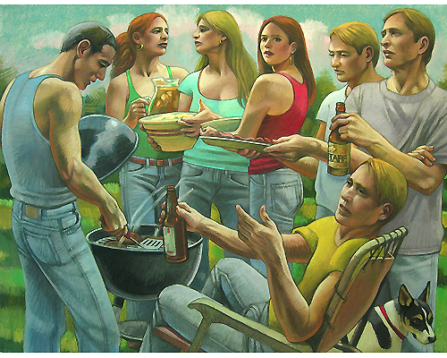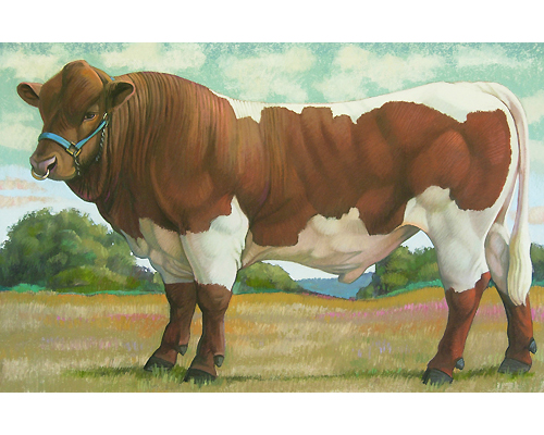 I try to make my work many-layered, both in meaning and technique. A drawing of a bull is just that, an exploration of the form of the actual animal, but it is also an experiment in color, line and composition, and a venture into the psychology of human-bovine relations. There is always an undercurrent of humor in my work. This may just be the fact that I'm depicting a heroic dachshund or an elegant swine, or it may be something more subtle, as in an improbable aqua sky.