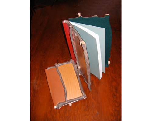 Stick Books, pear branches, leather, birch plywood, felt and paper